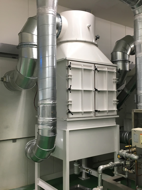 そこでまず、適正な風量が確保できるよう再設計を行い、排気ファンを入れ替えました。それと同時に、油煙や臭いを屋外になるべく飛散させないよう、弊社の油煙回収装置(デミスター式ミストコレクター)を導入して頂きました。